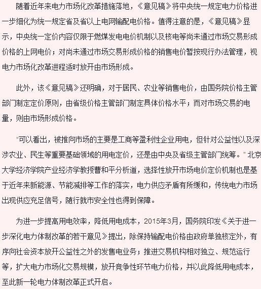 小編了解到,目前國(guó)內(nèi)的天然氣、成品油、電力等市場(chǎng)化的定價(jià)改革將要更進(jìn)一步。11月份,國(guó)家發(fā)展和改革委員會(huì)發(fā)布了《中央定價(jià)目錄》的意見征求稿,此次意見稿將針對(duì)15年的《中央定價(jià)目錄》進(jìn)行全面的修改和整理,在該基礎(chǔ)上將定價(jià)的項(xiàng)目減少到16個(gè)左右,除了保留基礎(chǔ)交通運(yùn)輸、重大水利工程供水、油氣管道運(yùn)輸、重要郵政服務(wù)、輸配電、重要專業(yè)服務(wù)、特殊藥品及血液等七種民生服務(wù)項(xiàng)目,對(duì)于電力、天然氣、部分交通運(yùn)輸領(lǐng)域的一部分定價(jià)項(xiàng)目進(jìn)行調(diào)整,本次的市場(chǎng)化定價(jià)機(jī)制改革或?qū)⒌贡茋?guó)內(nèi)大量的售電公司通過(guò)技術(shù)改革和創(chuàng)新來(lái)降低銷售成本進(jìn)而提高企業(yè)利潤(rùn)。