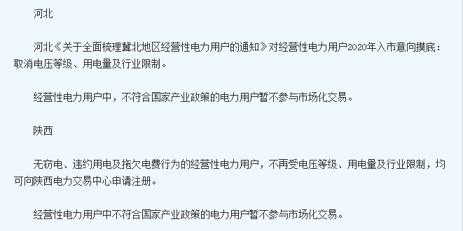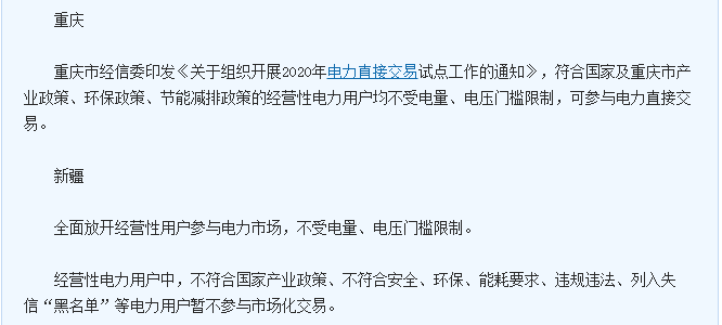 今年,國家發(fā)改委發(fā)下通知,經營性電力用電將全面放開,這一來,全國各省市的準入門檻是否會降低呢?到現(xiàn)在已經十一月中旬,全國多個省市也公布了明年關于電力市場用戶的相關準入要求。