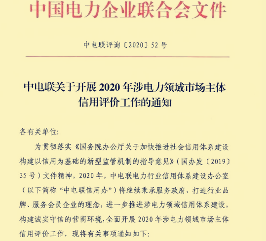為了加快推進(jìn)社會信用體系建設(shè),構(gòu)建一個以信用體系建設(shè)型的監(jiān)管機制,前陣子,中電聯(lián)發(fā)布了一則《關(guān)于開展2020年涉電力領(lǐng)域市場主體信用評價工作的通知》。
